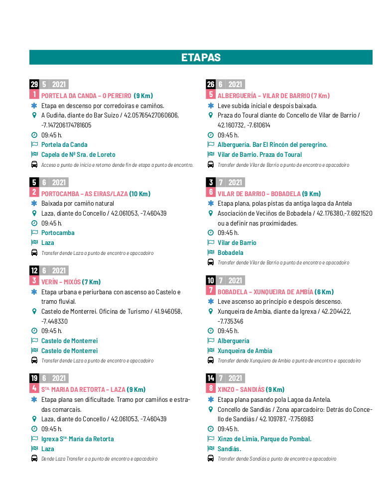 la actividad se realizará desde A Canda en el concello de A Mezquita hasta Santiago de Compostela. Los 20 municipios por los que se desarrollará esta andaina son: A Canda; A Gudiña; Laza; Vilar de Barrio; Xunqueira de Ambía; Baños de Molgas; Paderne de Allariz; Taboadela; San Cibrao das Viñas; Ourense; Amoeiro; Vilamarín; Cea; Piñor; Dozón; Lalín; Silleda; Vedra; Boqueixón y Santiago de Compostela.