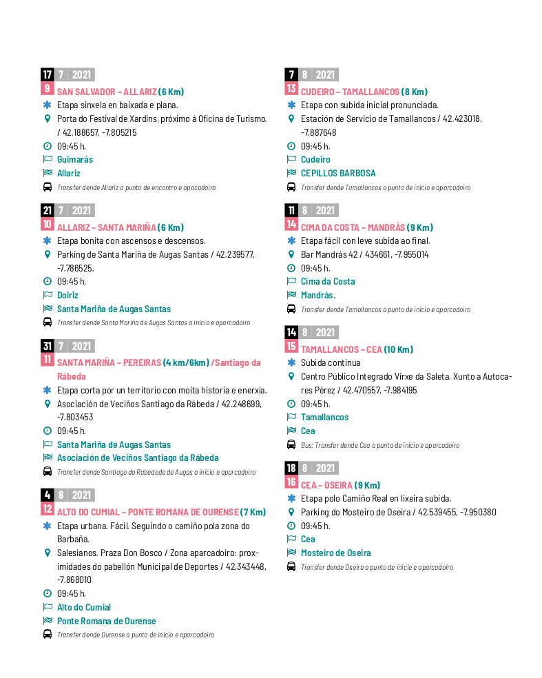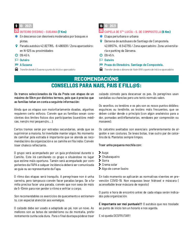La actividad se llevará a cabo entre los meses de mayo y octubre de 2021. Además, al finalizar el proyecto, el 3 de septiembre de 2021, la FAPA realizará una fiesta de fin de etapa en un concello de la Provincia de Ourense situado en el camino. Pueden participar todas las familias de la provincia de Ourense y la población de los concellos de la zona.